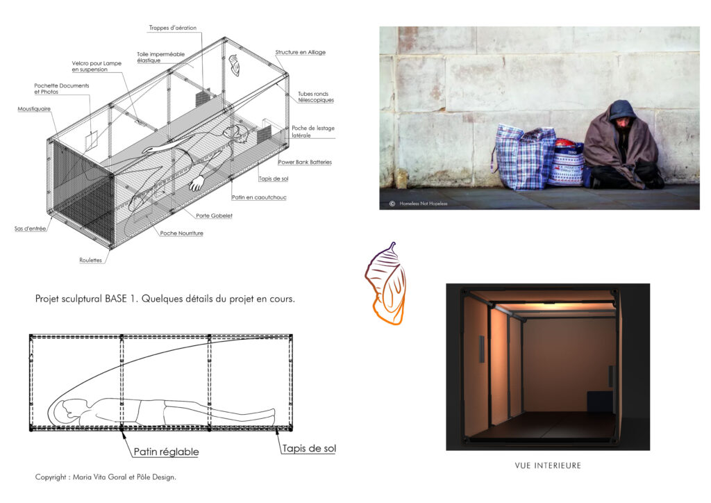 Base 1 consiste en une sculpture-abri autonome destinée aux personnes sans domicile fixe. L’œuvre se présente sous la forme d’un sac à dos transformable qui se déploie en capsule horizontale individuelle. L’objet se tient dans la mobilité mais il se déploie dans la nécessité.