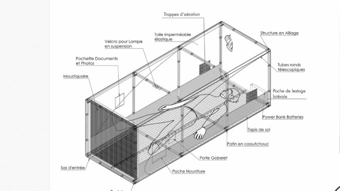 La structure tubulaire auto-bloquante, ultra-légère et résistante, est recouverte d’une double couche isolante en tissu imperméable, ignifuge et extensible. L’étude des matériaux, du poids, des conditions climatiques et de la longévité témoigne d’une approche rigoureuse. Une recherche de terrain auprès de personnes sans-abri a nourri le développement du projet, intégrant les contraintes concrètes de l’errance urbaine.
