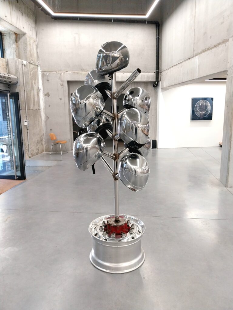 Parmi ces présences, la sculpture Knight Rider Crusade de Xavier Mary agit comme un point de condensation particulièrement aigu. L’œuvre s’origine dans un détail urbain aperçu le long de Lalbagh Road à Bangalore, sur la route du jardin botanique de Lalbagh: un simple support pour casques de moto devenu matrice sculpturale. Son titre convoque l’imaginaire de la série américaine Knight Rider (connue en Europe sous le nom de K2000) et tout ce qu’elle charrie de fantasmes technologiques, de mythologie pop et de promesses futuristes. Développée initialement en 2024 dans le cadre de l’exposition Garage chez Celador, la pièce se voit ici amplifiée par l’ajout de casques chromés miroirs supplémentaires, qui accentuent sa dimension réfléchissante et son aura techno-futuriste. Chez Mary, l’objet trouvé devient ainsi surface spéculaire d’un imaginaire globalisé, où l’acier, la vitesse et la fiction télévisuelle composent une mythologie industrielle .