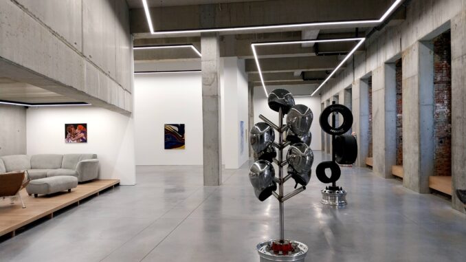 Enfin, la présence de L « Lazaros », Leo Luccioni ou Xavier Mary introduit quant à elle un déplacement vers la matérialité, l’architecture et la structure. La fragilité poétique de Luccioni (avec sa néo-madeleine de Proust du collier en bonbons), la rigueur décorative de Lazaros (avec sa vasque, ses ampoules et sa stèle), mais surtout la tension industrielle de Mary (avec notamment son porte-pneus Wheel of pain) fissurent l’hégémonie picturale et ouvrent l’espace à une lecture plus spatiale, totalement à-propos dans l’enceinte brutaliste de la galerie.