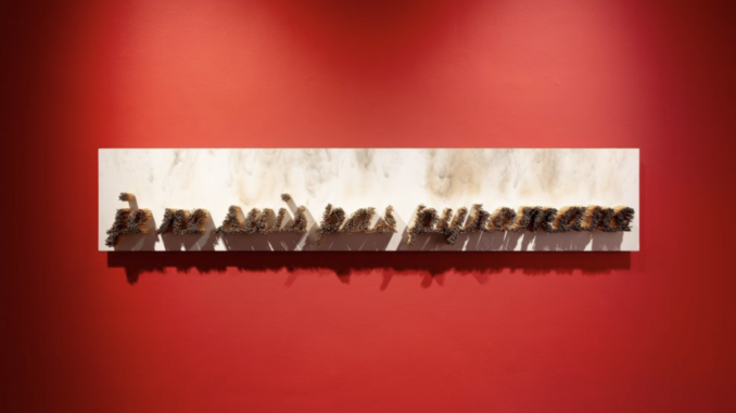 L’accueil se fait avec « Red Fire of Live »,rougeoyante installation spectaculaire en porcelaine de Jiana Kim (1972), flammèches figées en suspension entre plusieurs étages au centre de la Villa Empain.Inévitables, les objets consumés par Arman (1928-2005) passent de l’état d’utilitaires à celui de sculpture au-delà d’un statut de vestiges, en quelque sorte une action oxymore qui pratique la destruction en vue d’une création. L’artiste pousse d’ailleurs le procédé jusqu’au bout lorsqu’il reproduit en bronze une œuvre qui imite un objet réel brûlé ayant servi de modèle.