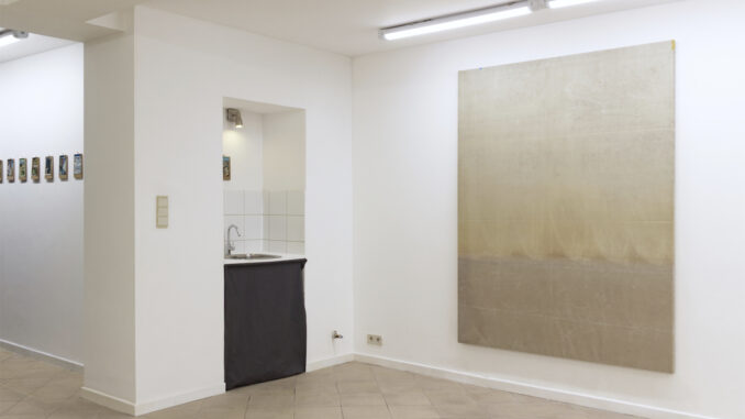 En écho à cette sélection de cartes postales, l’artiste présente plusieurs œuvres sur bâche de camions, qu’il récupère aux alentours de Welkenraedt et d’Eindhoven. Ces bâches usagées sont sélectionnées, nettoyées, découpées puis travaillées avec différentes encres et pigments auxquels il ajoute des vinyles adhésifs. Ces mêmes vinyles autocollants sont par ailleurs utilisés dans la communication visuelle, sur les vitrines et enseignes des commerces.