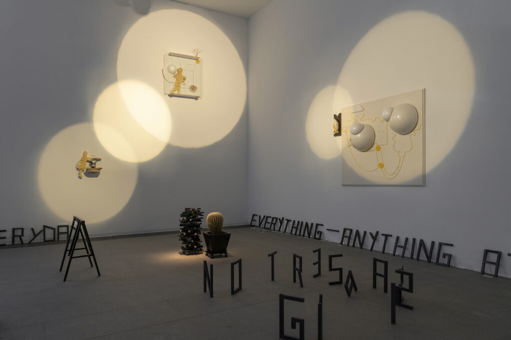 Des lettres noires isolées, interchangeables, se dressent contre les murs comme des pensées autonomes, insinuant des significations face à un globe terrestre blanc, façon Mercator, en polystyrène : un objet fragile, susceptible de tourner, de changer ou de se cabosser à tout instant.