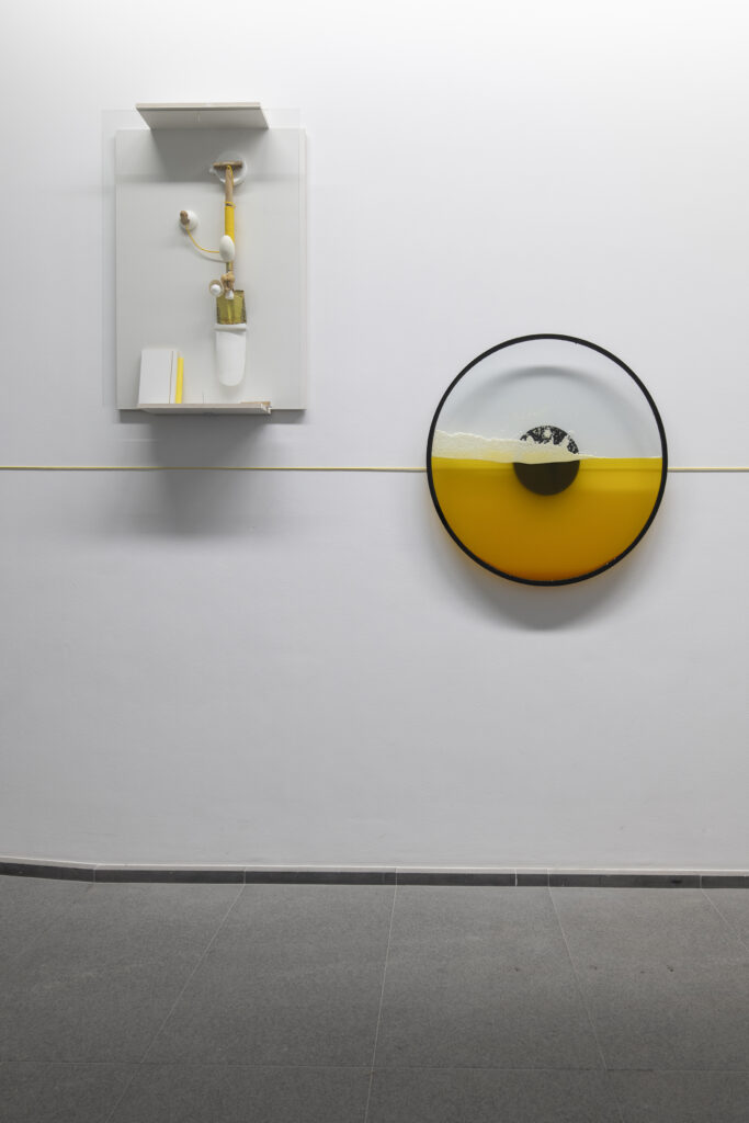 In de smalle gang naar buiten hangen wonderlijke glazen schijven die smeken om ferm gedraaid te worden; wat kinderen met full force ook graag doen! De schijven, gevuld met zand of vloeistof evoceren stormen van niet te schatten tijdelijke schoonheid.