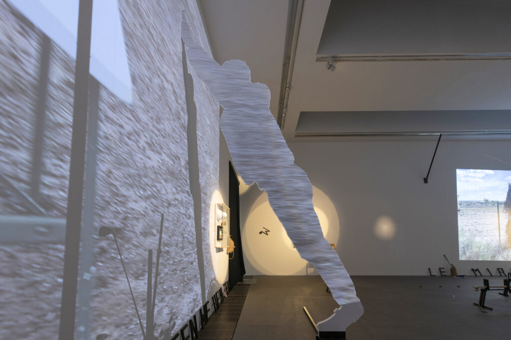 « Quarantaine » est un titre étrange et peu engageant pour le public ; la vaste salle, privée de lumière naturelle, baigne dans l’obscurité et ne s’éclaire que par des projecteurs ciblés ou non, et par la rémanence lumineuse de projections vidéo monumentales. Il n’y a ici ni début ni fin de parcours clairement identifiables ; écrire sur cette exposition devient presque impossible, tant Honoré d’O privilégie une pensée et une pratique labyrinthiques, associatives et cahoteuses.