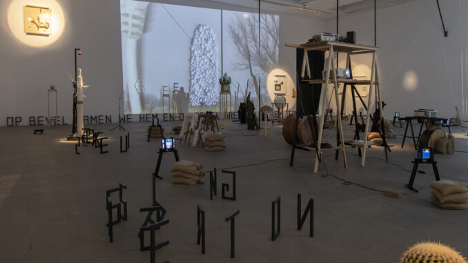 L’immense espace du MAC’s est aménagé comme l’intérieur confus de la tête de l’artiste lui-même ; l’espace devient un enchevêtrement déroutant, une ode à son autoportrait imaginaire qui refuse toute réduction à l’« autonomie ». L’installation fonctionne comme une chaîne lâche d’éléments qui entretiennent tous, d’une manière ou d’une autre, des relations réciproques.