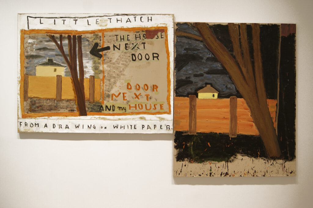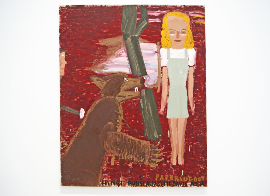 Ce luxe ostentatoire et la richesse qui lui est corrolaire trouve un reflet dans la présence à Paris d’un poids lourd du marché de l’art new-yorkais en la personne de David Zwirner, un bon galeriste au demeurant, qui s’est installé dans l’espace occupé autrefois par Yvon Lambert. En ce printemps, il amène à Paris un morceau de l’actualité londonienne puisque ce n’est autre que la peintre Rose Wylie qui apparaît en ses cimaises. C’est une artiste d’un âge respectable, 92 ans, dont tout le monde parle à Londres du fait de sa rétrospective organisée à la Royal Academy of Art. C’est une figure détonnante, dont l’atelier chaotique n’a rien à envier à celui de Bacon, et ce n’est manifestement pas de la pose, mais bien le fruit d’un vécu, nécessairement extatique, avec le médium par définition maudit de la peinture. Son exposition parisienne est conséquente : de l’acabit d’un petit musée. On y passe son style en revue. Henri, Egypt… Bette, Bear est le titre de sa présentation qui découle d’un tableau du même nom, ou presque : Homage to Henri, Bette and Bear, 2026. Il s’agit en fait d’une oeuvre inspirée d’un tableau du Douanier Rousseau montrant un chasseur visant un ours occupé à effrayer une femme nue. Wylie transforme la femme nue en une jeune fille habillée jouant les effarouchées à laquelle elle confère les traits de l’actrice Bette Davis, soit la Belle. Et elle accentue encore l’aspect menaçant de l’ours, soit la Bête, en insistant sur ses pattes et griffes, toutes prêtes à étreindre la vulnérable créature. Une inspiration additionnelle venue à l’artiste après qu’elle ait vu un documentaire à la télévision dédié aux ours. Le tableau est peint avec une savante maladresse, et avec une savante véhémence.