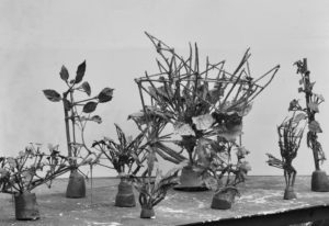 Maia Blandiau pratique le collage d’appareils liés au son (tourne-disques, circuits électroniques, cadran radio, bras de lecture, transistors, câbles électriques, moteurs…) pour les combiner en une structure-sculpture animée, sorte d’étrange amalgame énigmatique, arrière-petite-fille des ‘machines’ de Tinguely.