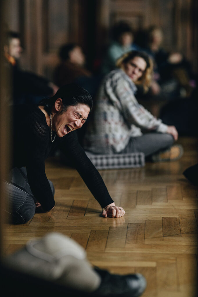 FLUX_ En effet, dans cette salle ici à Genève, c’était tellement beau de n’avoir aucune lampe allumée, juste la lumière émanant des grandes arches des fenêtres. Il n’y avait que cette lumière du jour, qui baissait peu à peu naturellement alors que les quatre heures de la performance avançaient et que dehors, les courtes journées d’hiver étaient encore un peu grises. Cela immergeait tout le monde dans une échelle temporelle commune, alors même que la qualité hypnotique des mouvements et des chants du groupe qui performait avaient plutôt tendance à nous faire perdre la notion du temps en nous amenant dans une forme de douce transe. Dans cet espace où le bois est omniprésent_ aux murs, au plafond et parquet_ le public s’est senti à l’aise pour s’installer un peu partout au sol sur les coussins comme cela nous était proposé, sans avoir à se réfugier sur les bords de la salle comme le veut le réflexe habituel. Et cela n’est pas forcément facile avec la timidité du public suisse! Mais là, ça a pris forme très spontanément, et cela a permis à la pièce de s’activer avec cette très touchante absence de séparation entre la performance et son audience.